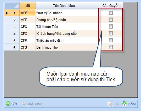 Sửa, tick những danh mục nào cần cấp quyền