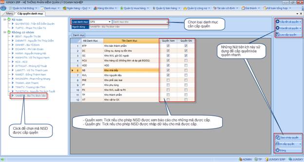 cấp quyền, phải khai báo trước trong Thiết lập thông số.