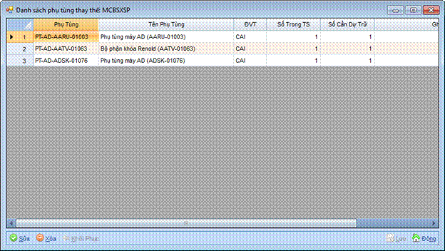 Danh sách phụ tùng: Liệt kê danh sách các mă phụ