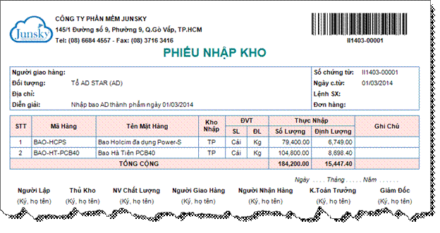 và Định mức (BOM). Dữ liệu phiếu nhập