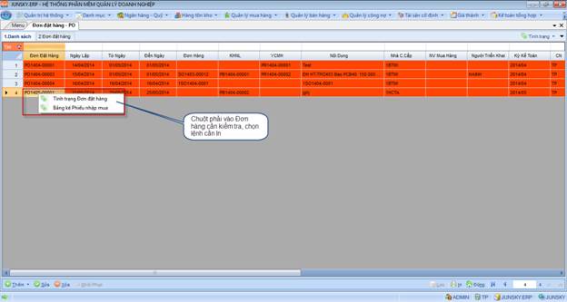 phải 1 ô cột Đơn đặt hàng: Truy cập menu lệnh truy