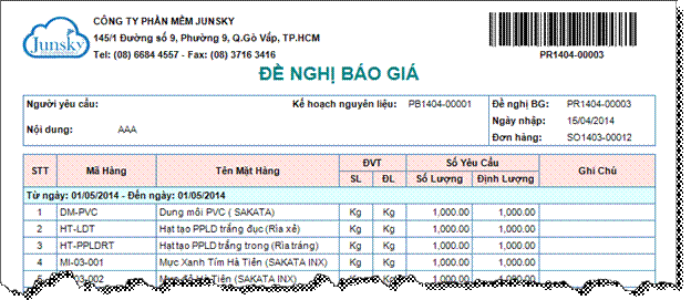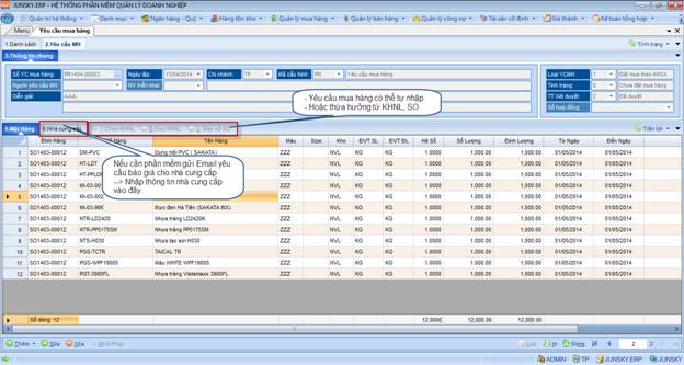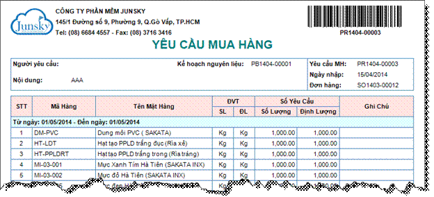 thông tin những mặt hàng cần mua cho bộ phận mua
